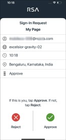 RSA sends a notification to your device. In the app, tap Approve. You can also tap an interactive notification on the device or on an Apple watch or Android wear watch paired to the device. You might be prompted to unlock your device after you tap Approve in the notification. Tap Reject if you did not request access to an application.